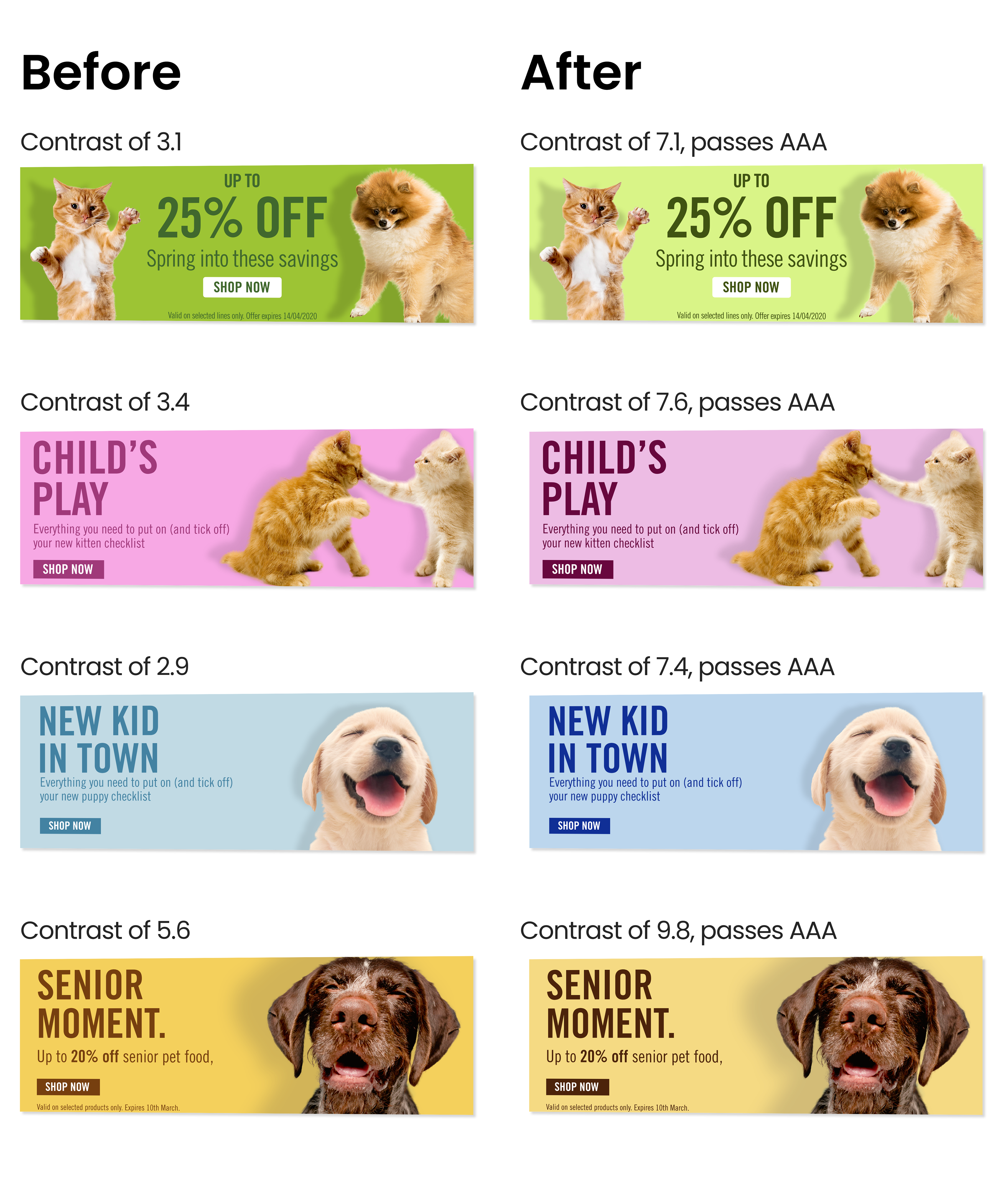 The Fetch brand is fun and playful but was missing an important feature for an online only business. The colour palette did not pass any contrast standards making it difficult to read. I went in and reworked the palette to pass AAA standards while keeping the fun and bright brand of Fetch.