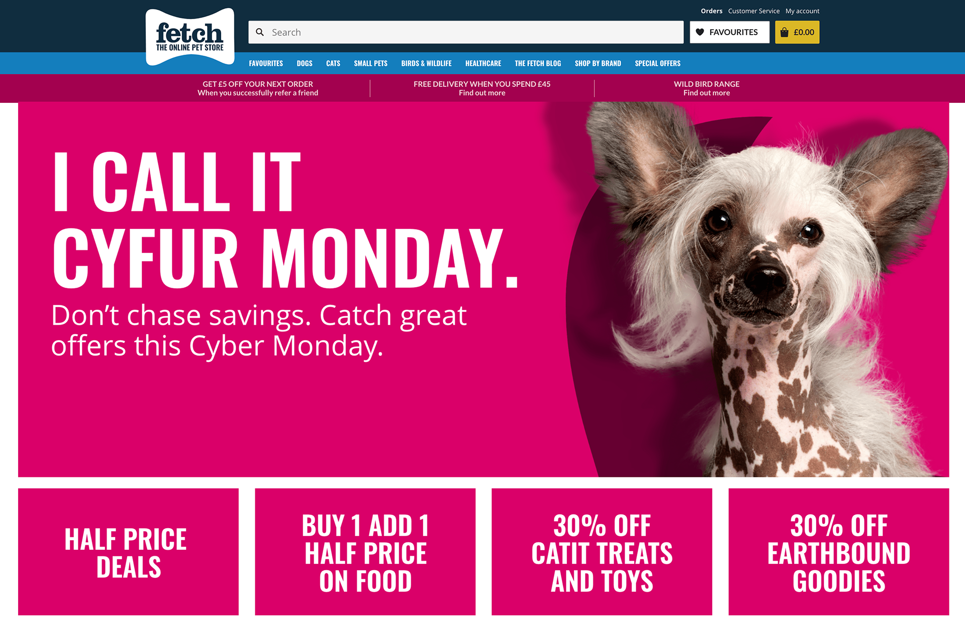Following Black Friday, Fetch wanted to go bold and bright for the Cyber Monday campaign. To bring the Fetch charm and irony to the campaign I took the "Cyfur" headline and went in the opposite direction. I found hairless pets to tell you all about our Cyfur Monday deals.