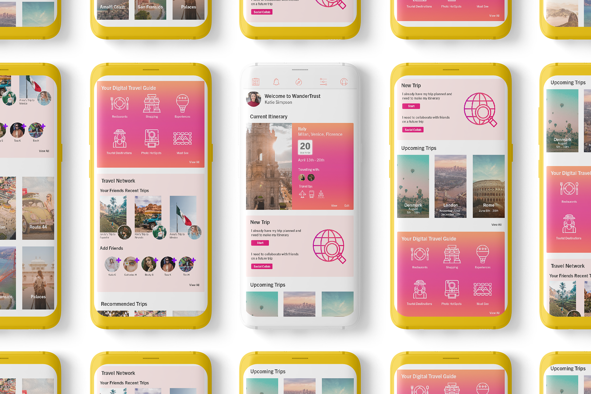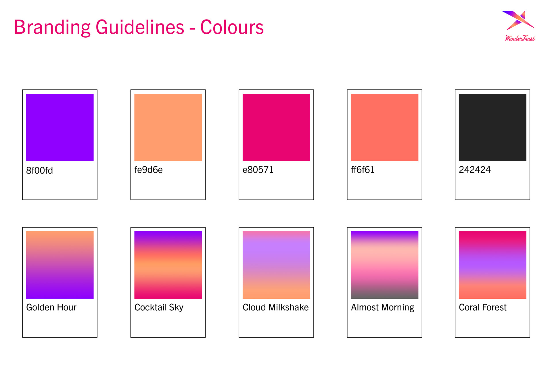 WanderTrust was an opportunity to really play with gradients and warmth. I took the Pantone colour of the year, a coral shade, and built my palette around that.